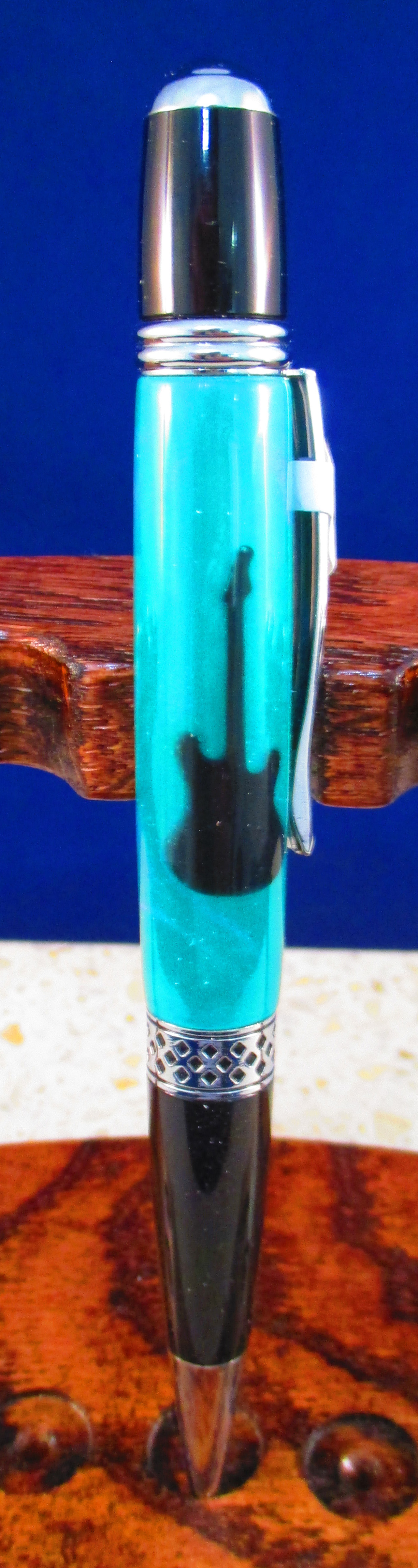 This beauty features a black bass Guitar poured on a green acrylic resin background. Custom color options available on request.