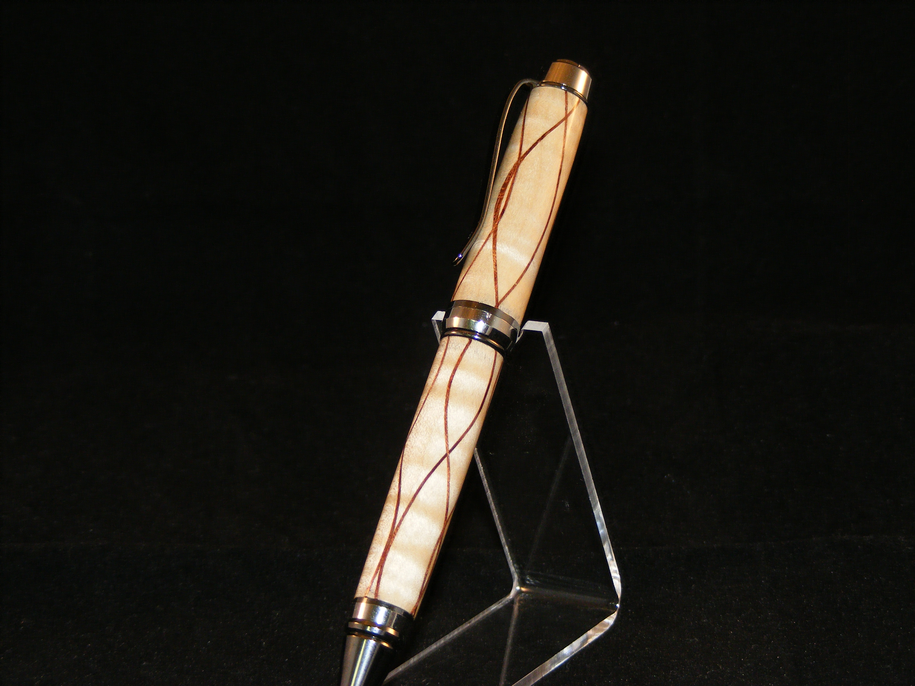 this handcrafted pen features curly maple with bubinga inlays trimmed with black titanium and platinum hardware