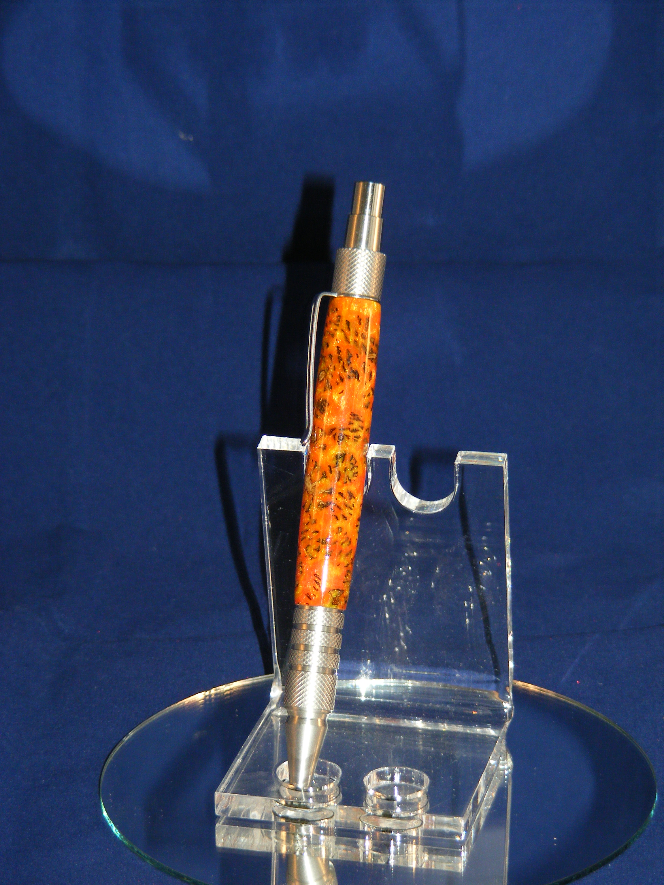 This click style beauty is made from 303 stainless steel and features knurled top and grip for a firm but comfortable feel, and a stainless steel clip. The body is cones from an alder tree in orange resin