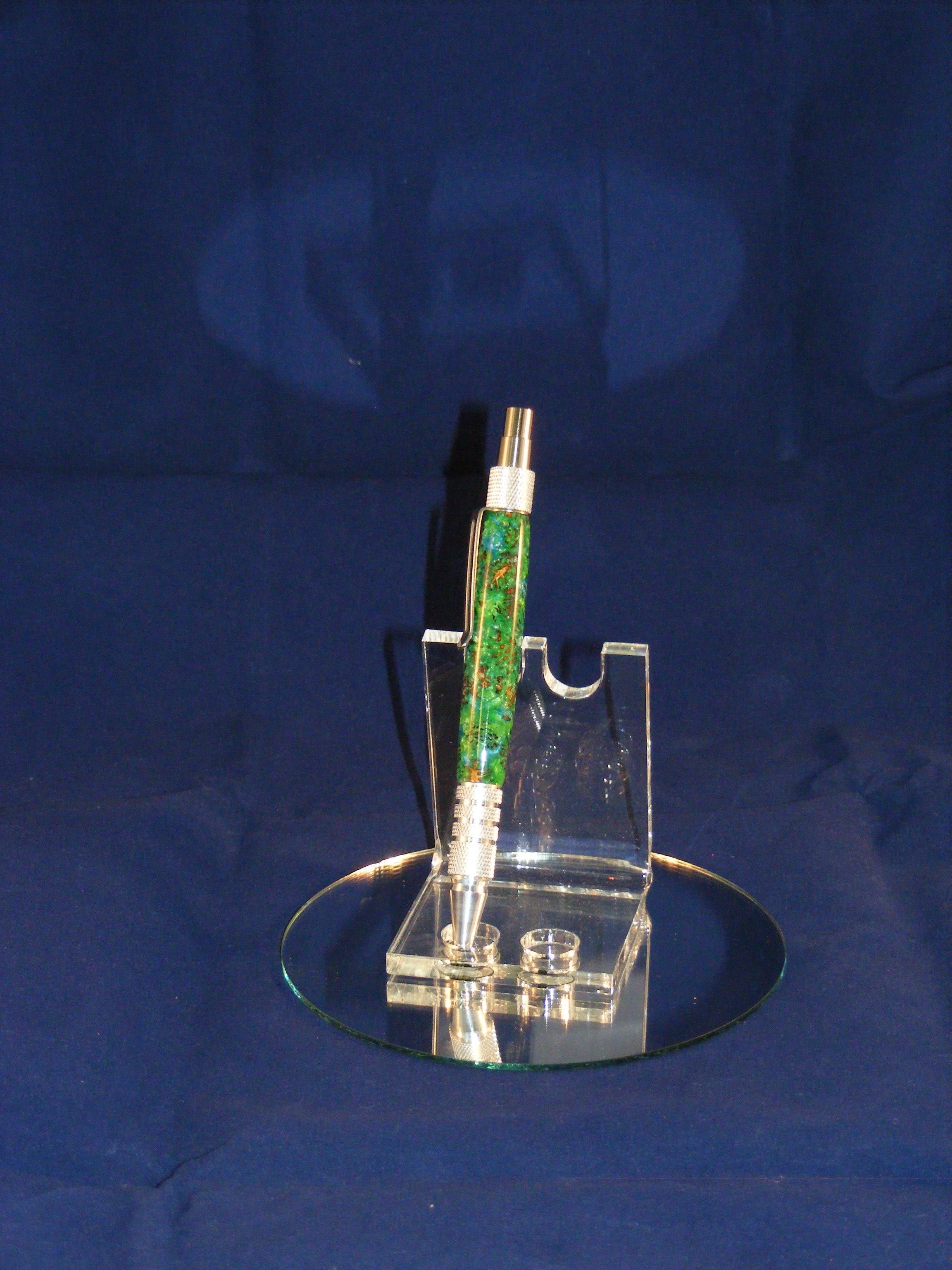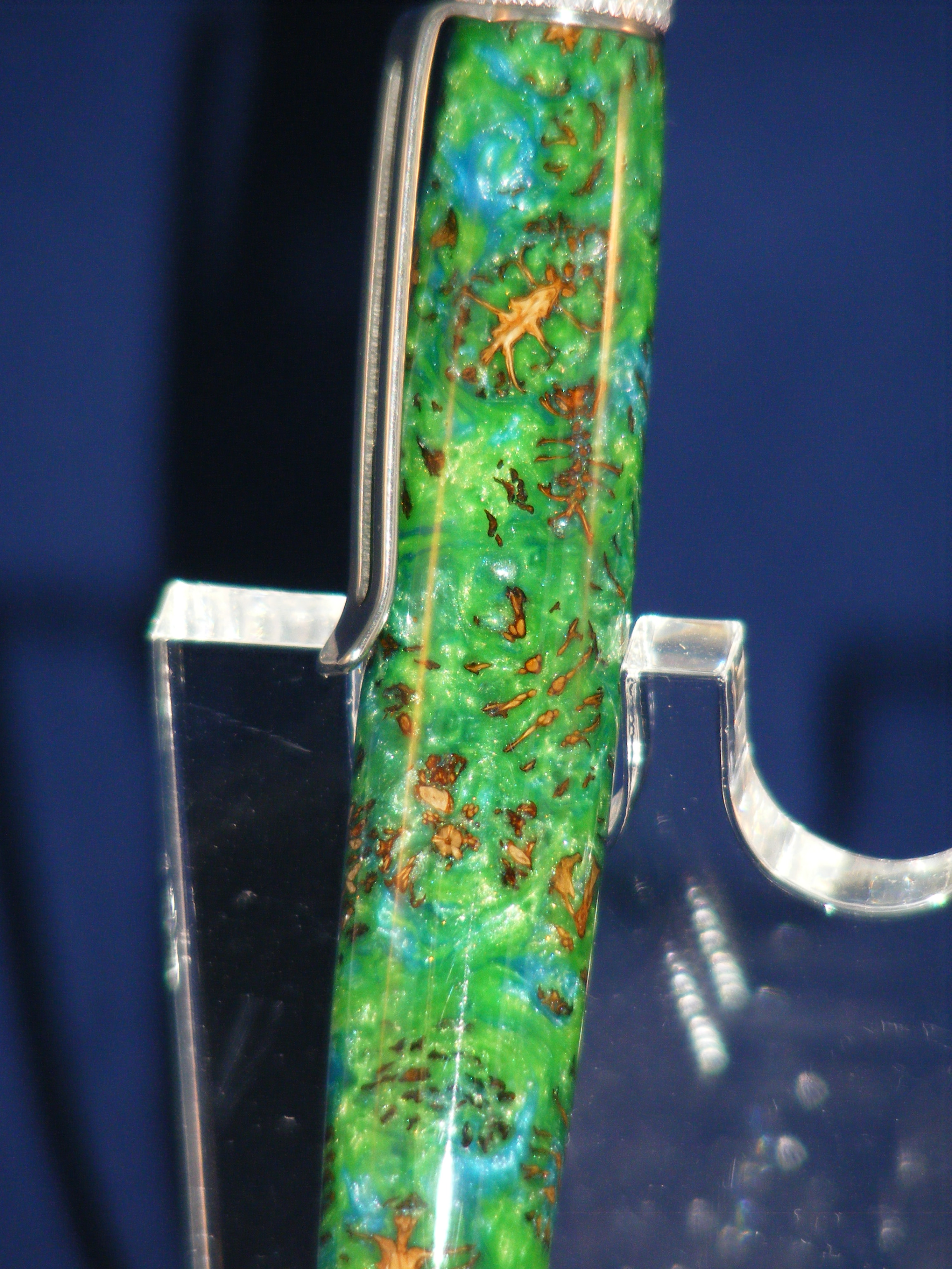 This click style beauty is made from 6061 T-6 aluminum and features knurled top and grip for a firm but comfortable feel, and a stainless steel clip. The body is cones from an alder tree in green and blue resin