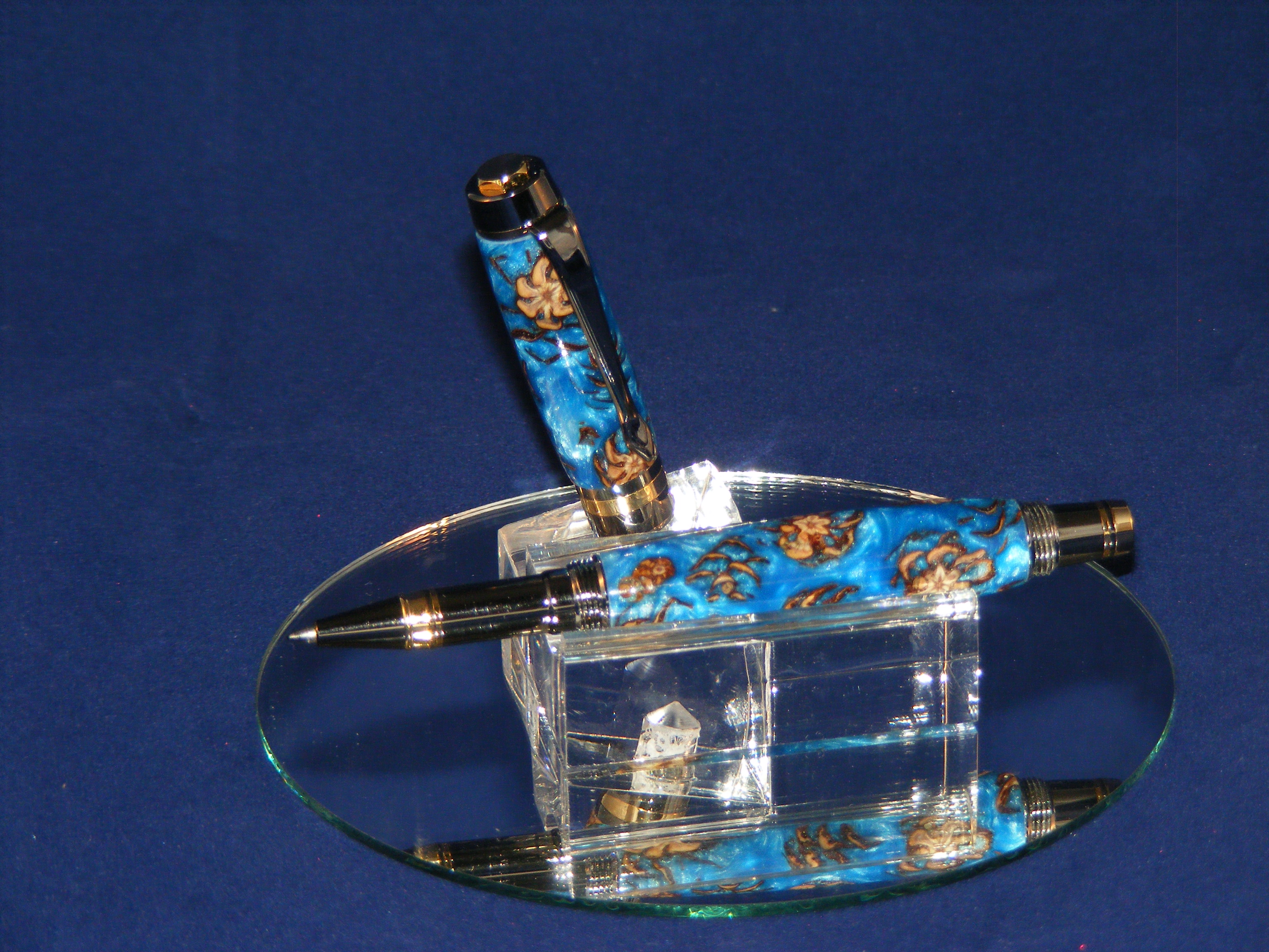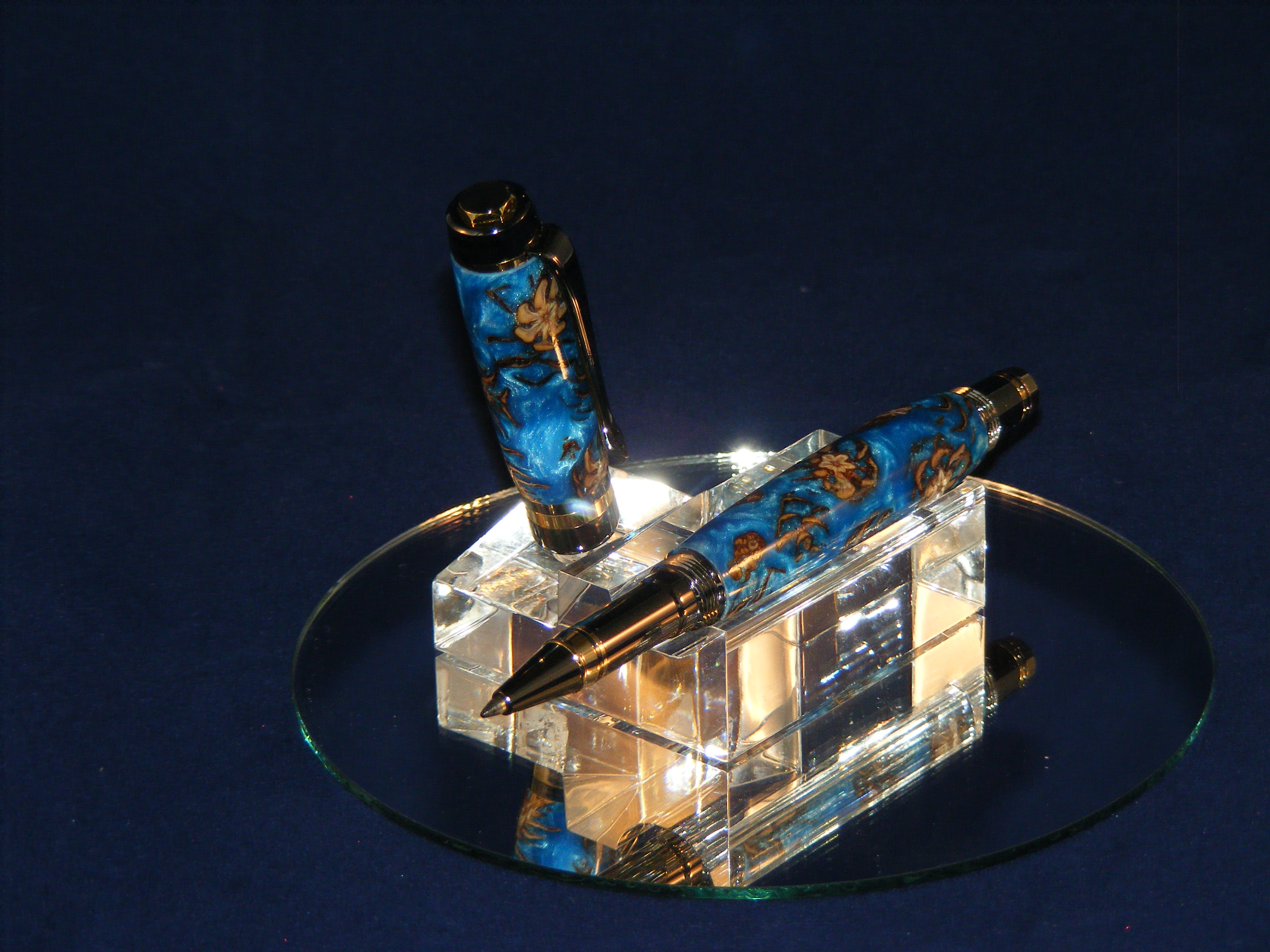 this rollerball features pine cones cast in deep blue resin, trimmed in gold and gunmetal.