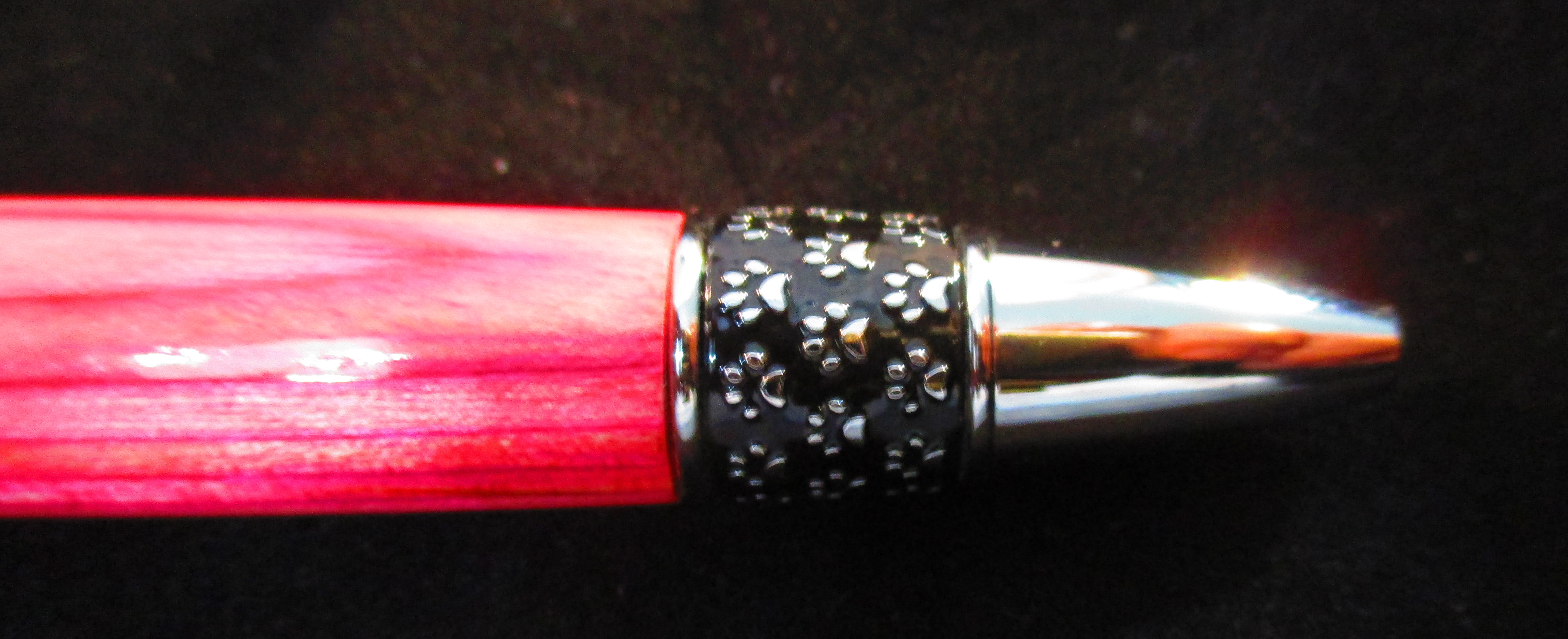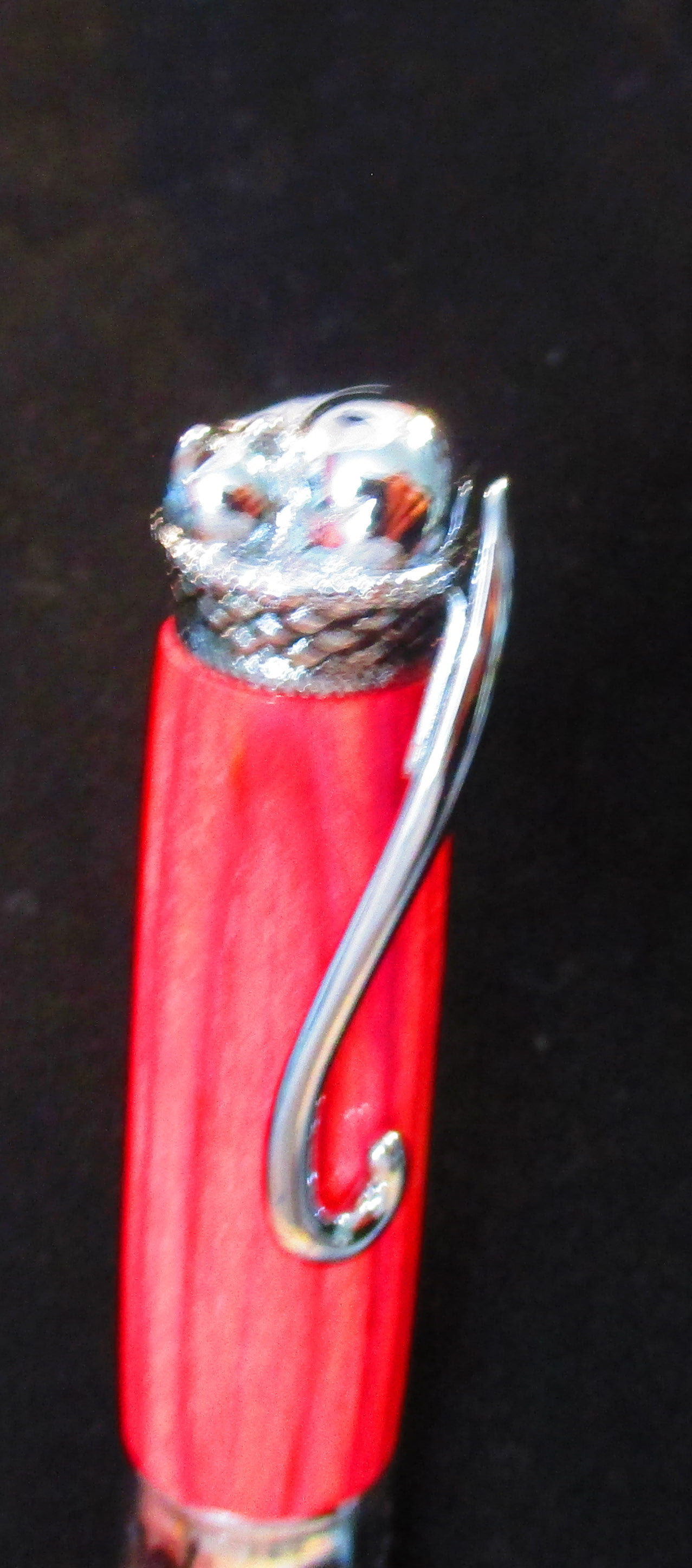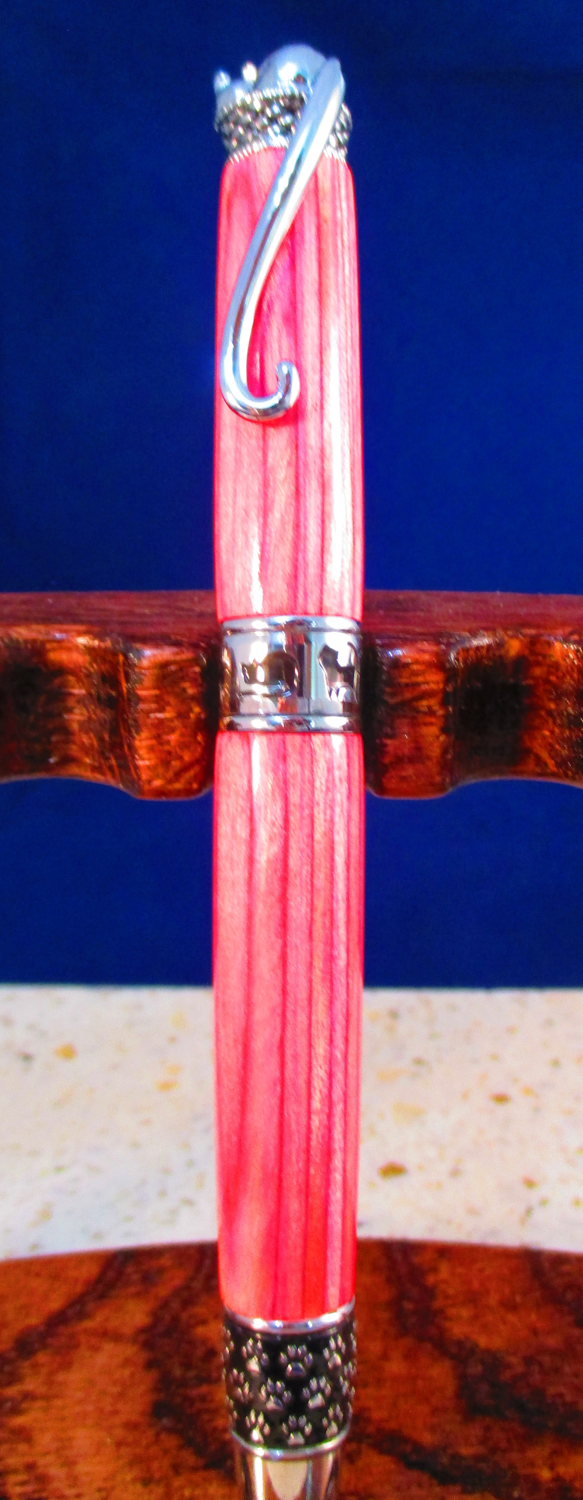 for the cat lover person, this pen is purr-fect. It features a cat curled on top and the tail becomes the clip, cat silhouettes around the center band and paw prints around the tiip.