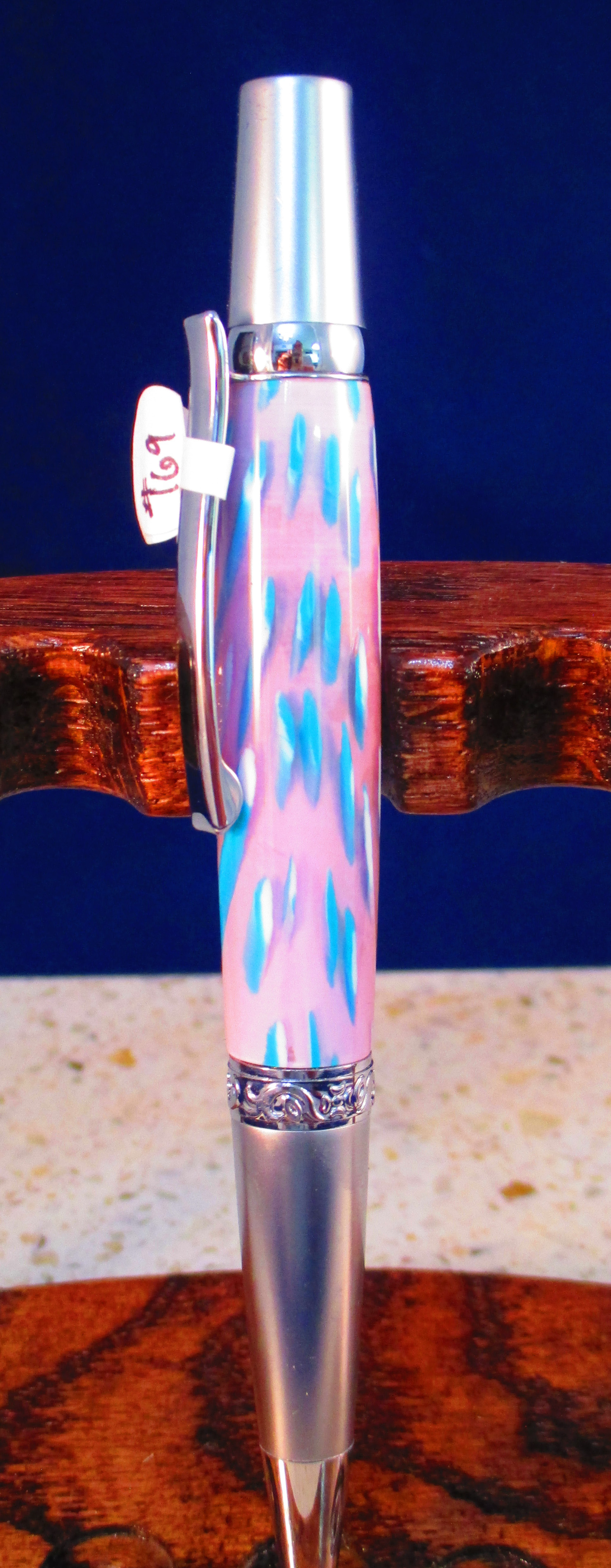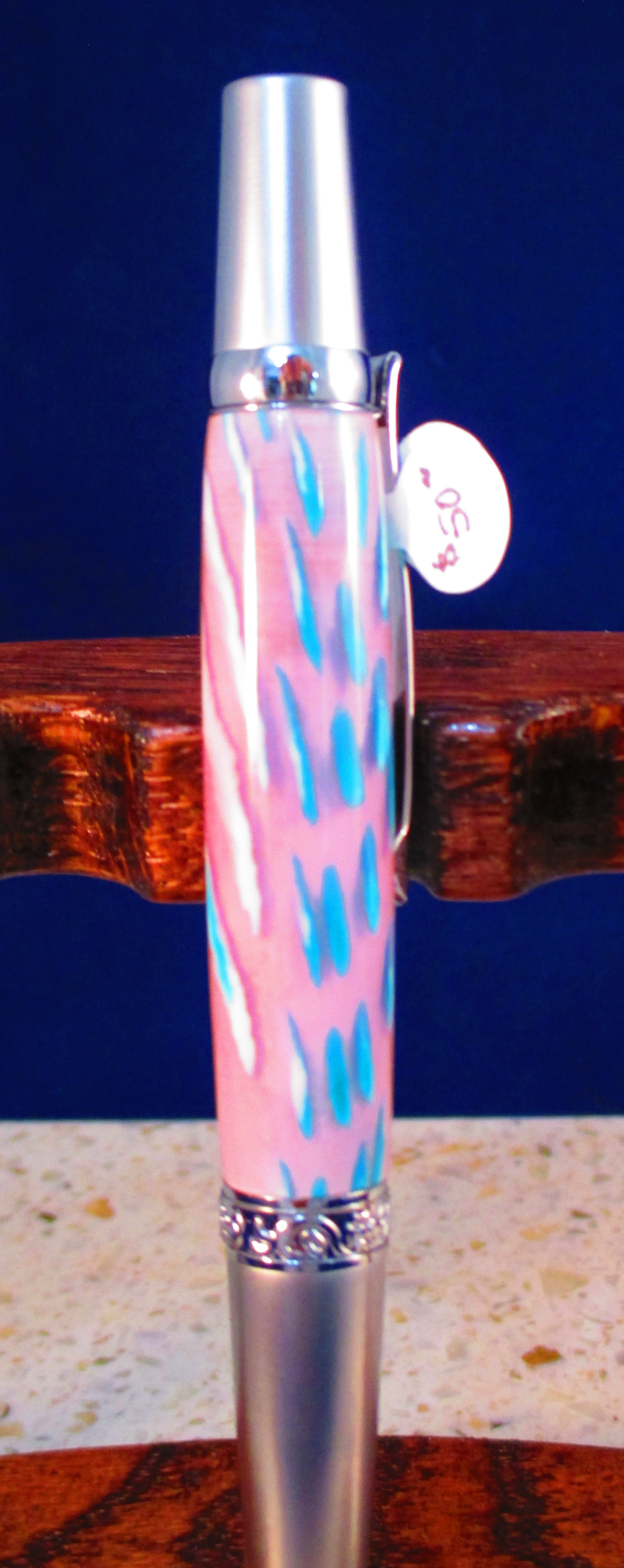 this beauty features brushed chrome finish and pink, blue, and white acrylic
