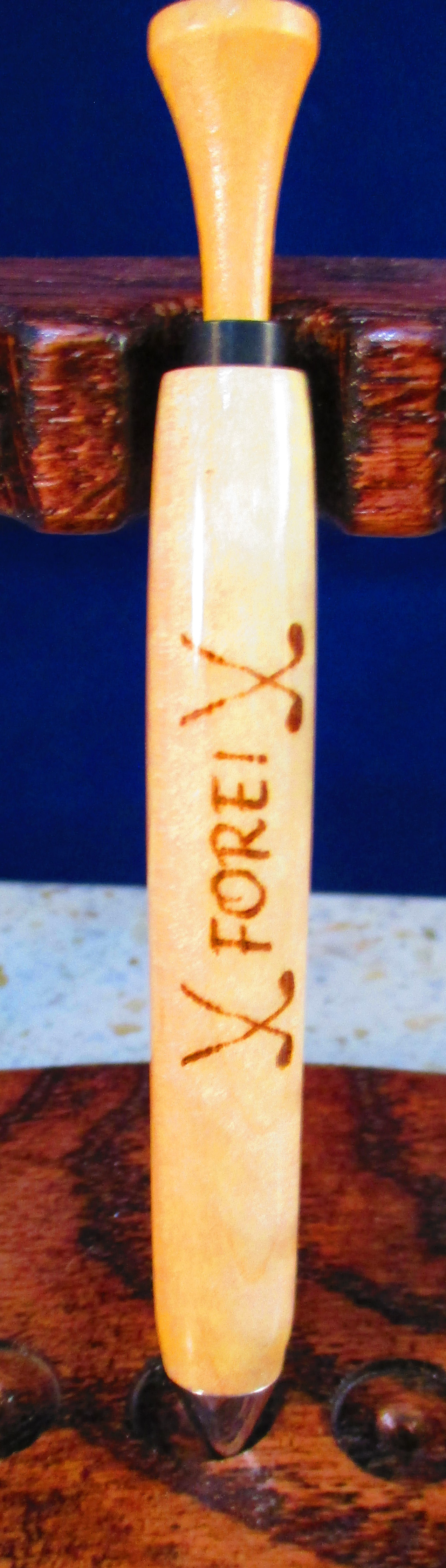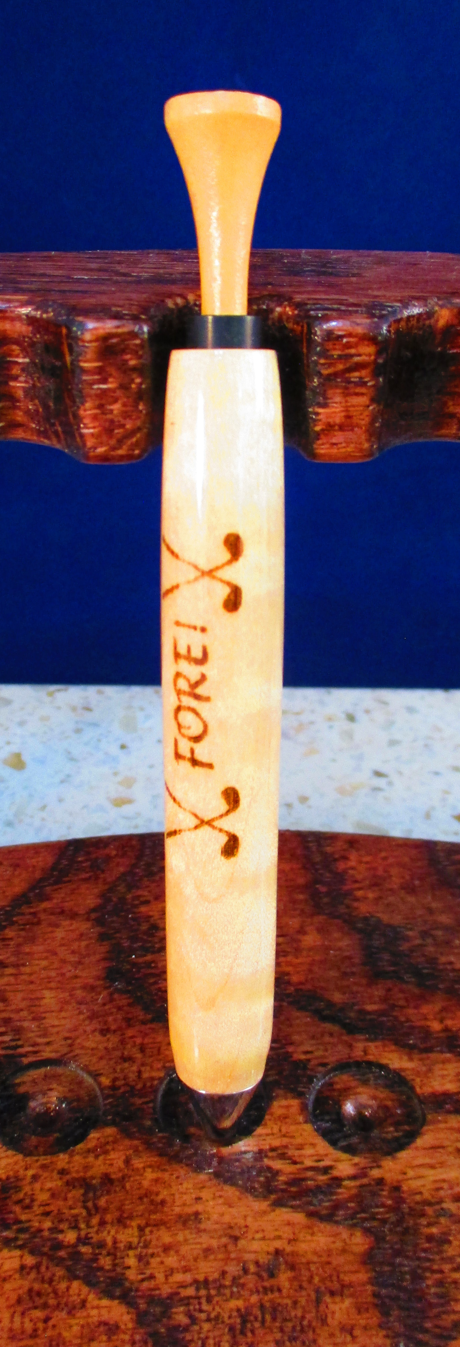 This little pencil is sure to please the golfer in your life. Features 2mm leas, a golf tee on the end to advance the lead. Dressed in curly maple and laser etched with crossed clubs and Fore!
