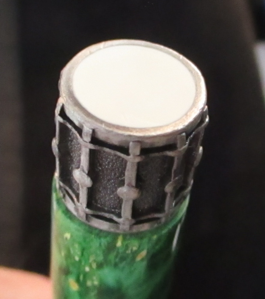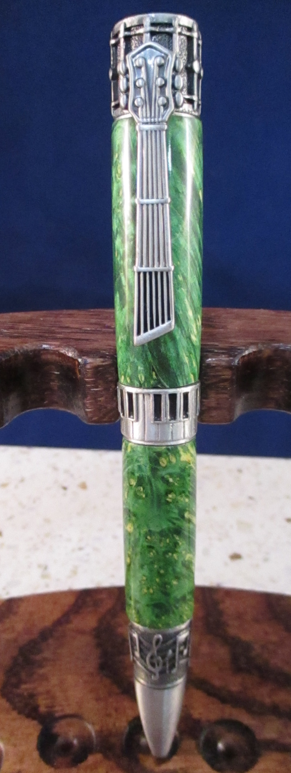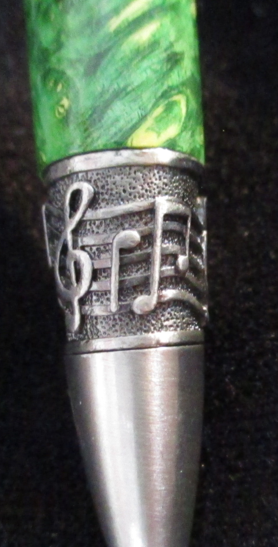 For the music lover in your life. Featuring a drum on the endcap, a guitar neck as the clip, piano keys around the middle band, and music staff and notes around the tip.