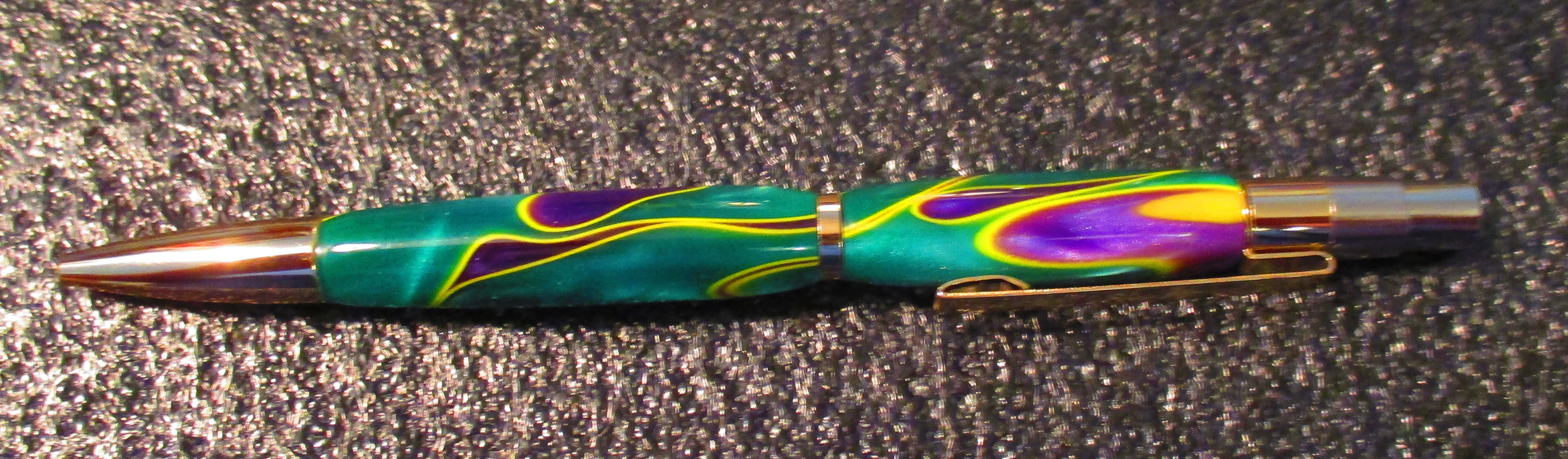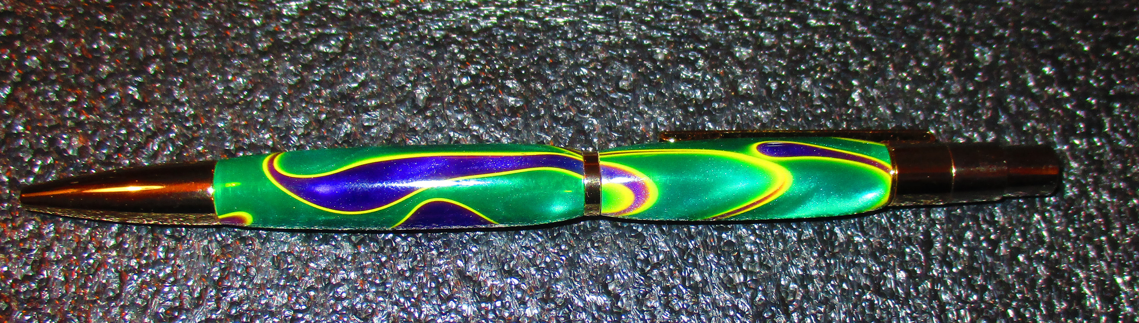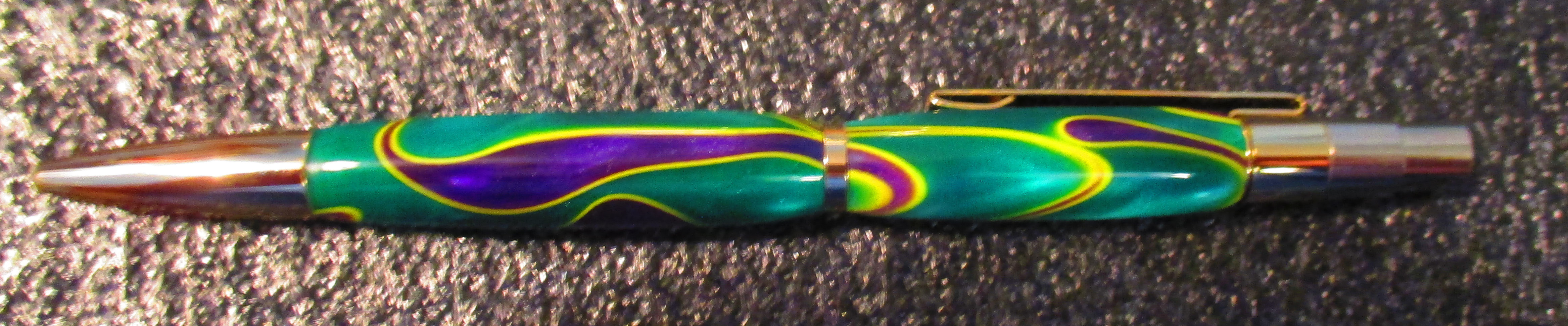 this slimline features a smooth click mechanism dressed in green and purple swirl acrylic. it does have a small blemish in the trim around the top, so the price has been reduced significantly.