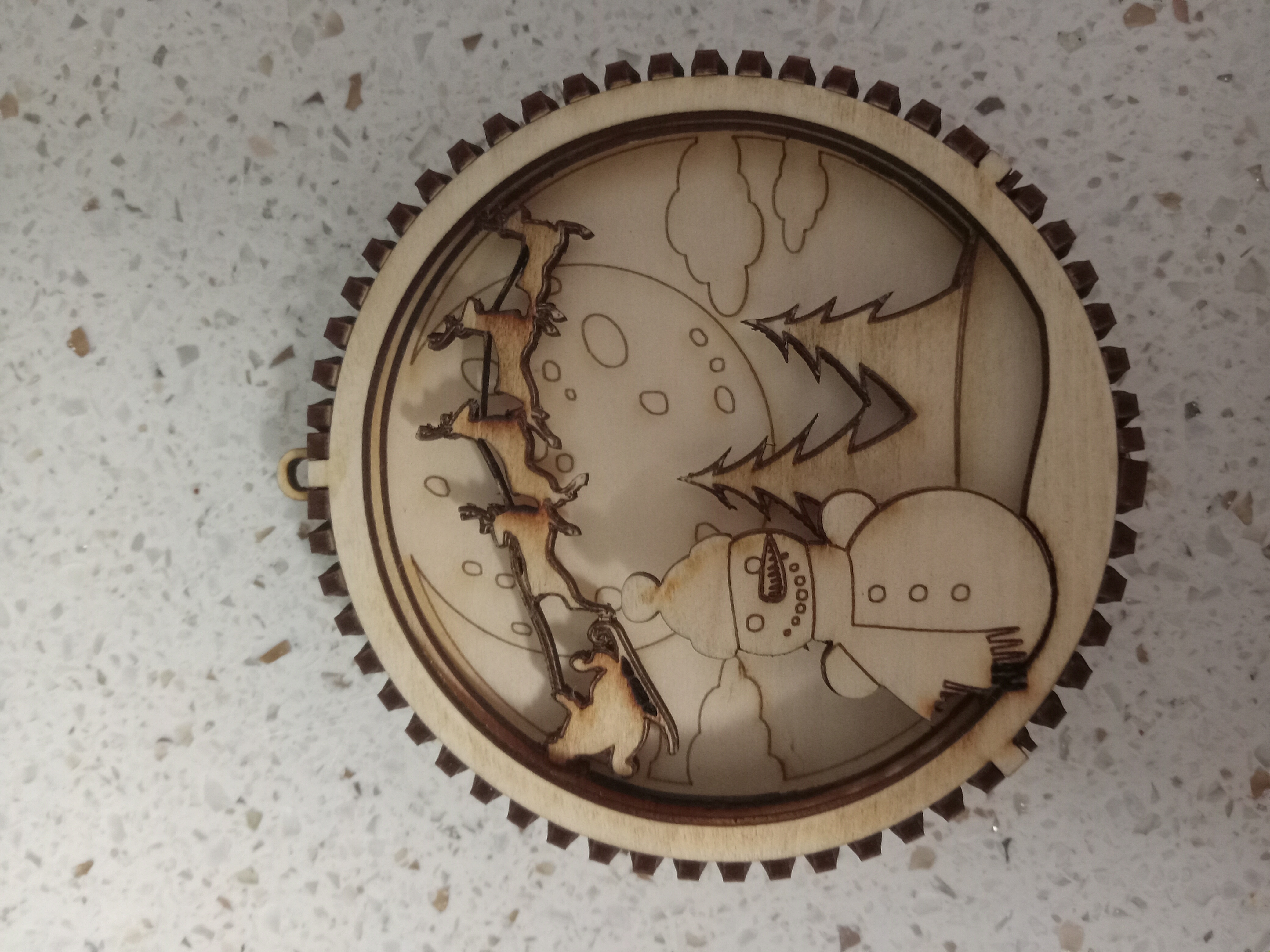 Mr Snowman watches as Santa and his sleigh fly thru the night sky in front of a full moon in this 3 layered ornament