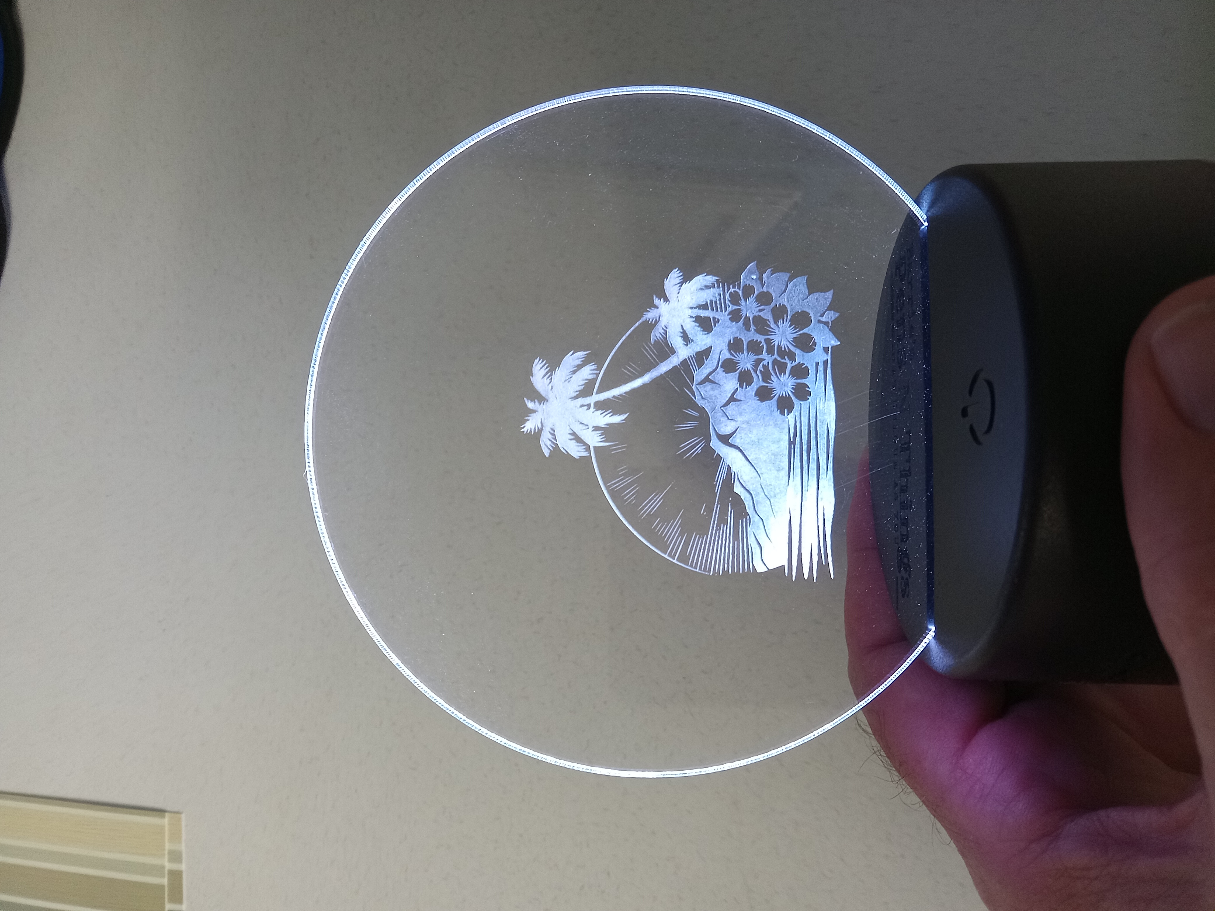 this LED acrylic sign features a small cozy beach scene. Includes LED base, remote and USB cable