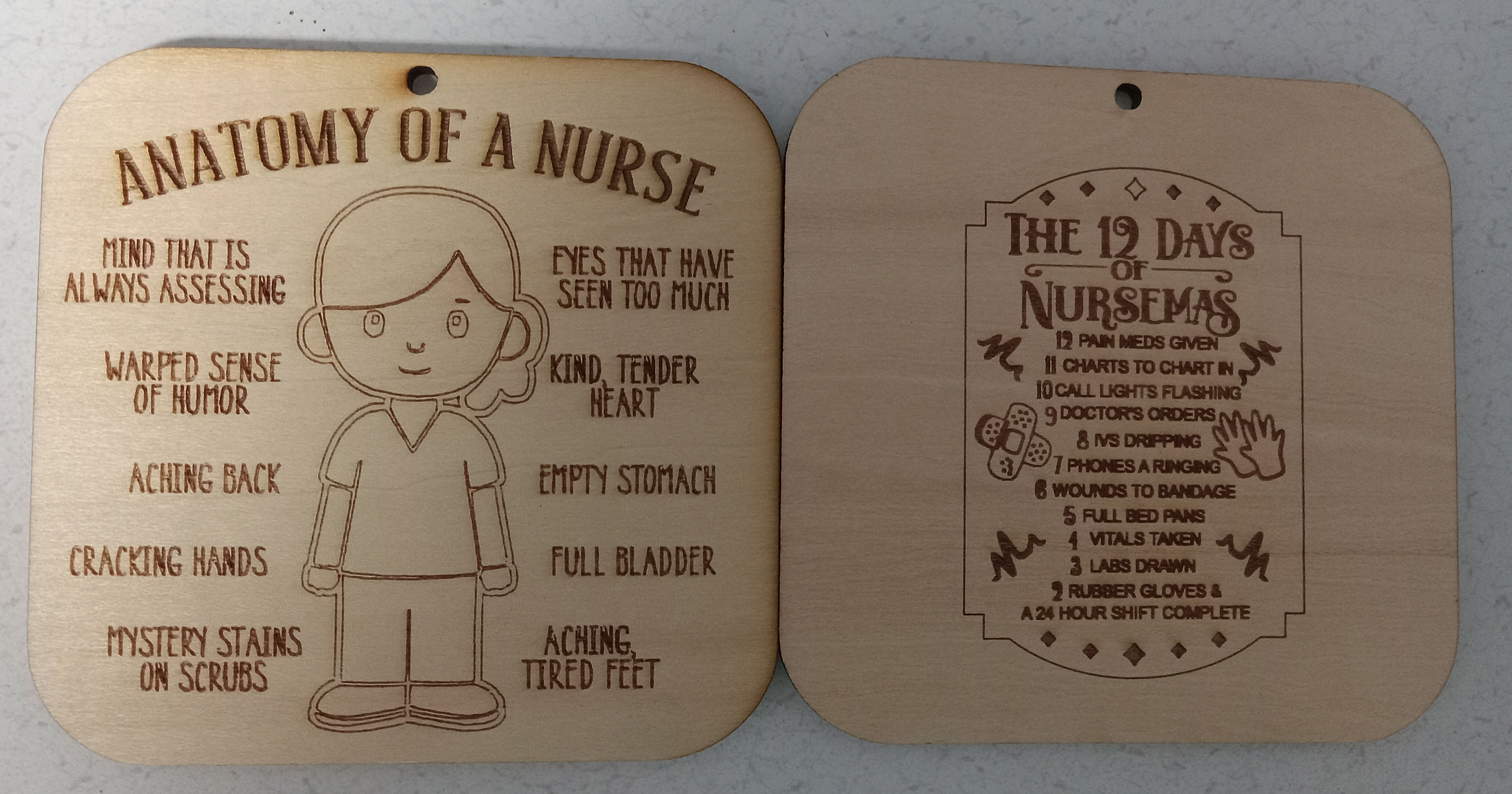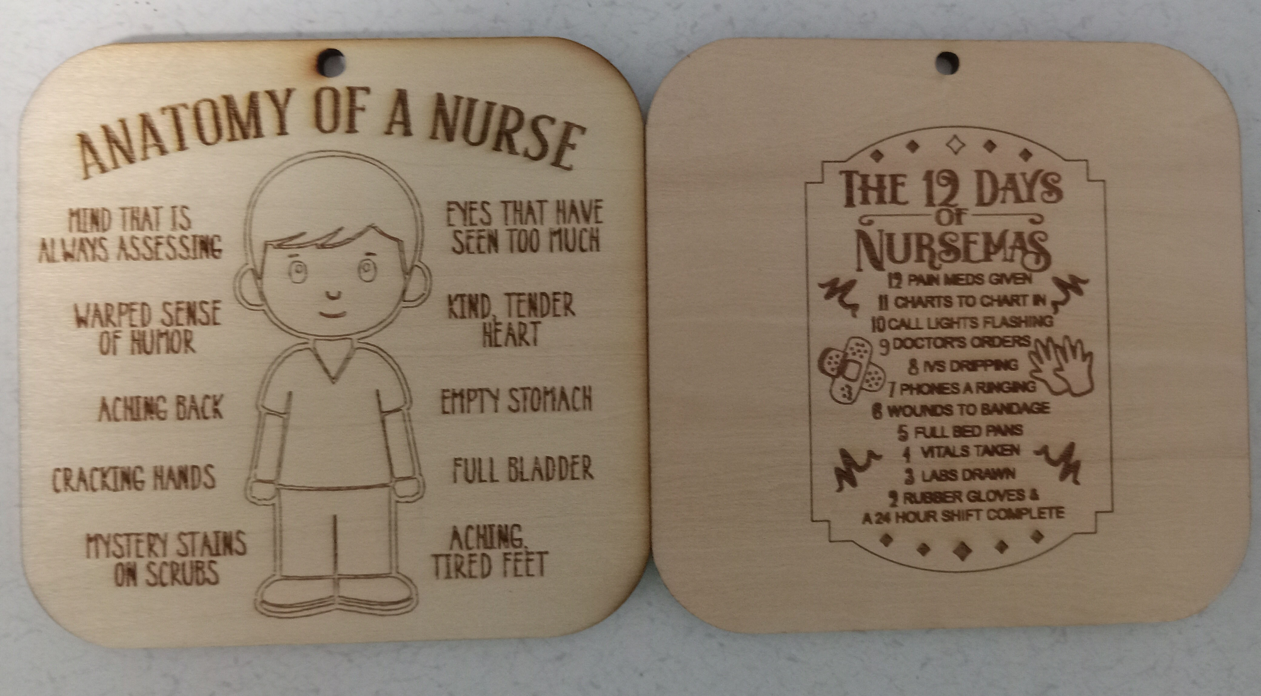 THIS ORNAMENT IS A TRIBUTE TO NURSES EVERYWHWERE. AVAILABLE FOR EITHER MALE OR FEMALE, EACH HAS "THE TWELVE DAYS OF NURSEMAS" ON THE BACK